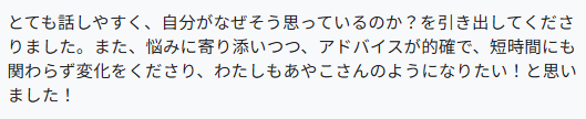 綾子さんいつも本当に丁寧にサポートしてくださり有難うございます!勇気を出して講座を受講してよかったと思います。これまで自分がコーチとしてやってくる中でモヤモヤしていた部分に対するアプローチが、綾子さんの講座の中には詰まっています。名ばかりコーチではなく、しっかり中身のある、生徒さんをしっかり導いていけるそんなコーチになれる内容をいつも教えていただいています。 私の理想とするコーチになれそうです! これからもどうぞよろしくお願いいたします♡